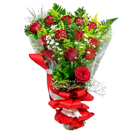 Ramalhete com 12 rosas, acompanhado de áster, tango e folhagens, com enfeite por fora do buquê e laço de fita TNT.