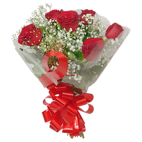 Buquê com 6 rosas, gipsofila e folhagens
