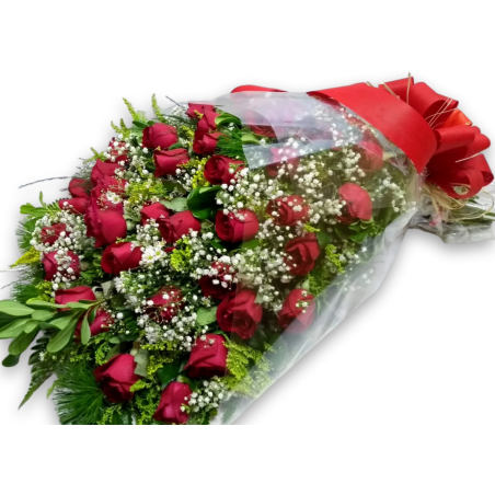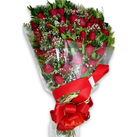 Ramalhete especial com 40 rosas, com áster, tango e folhagens.