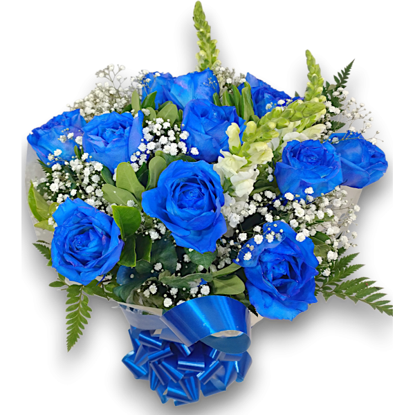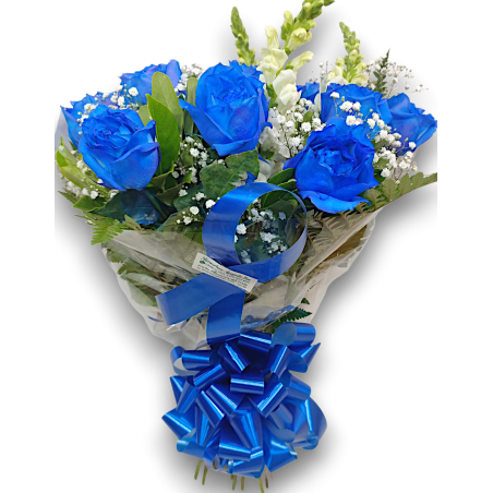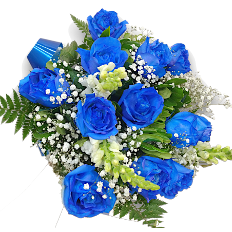 Buquê redondo com 12 rosas azuis, áster e folhagens