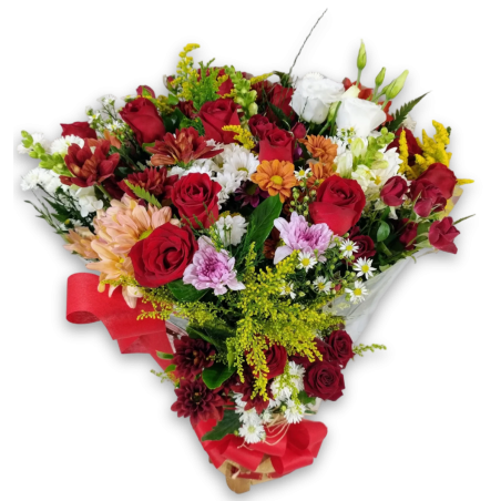 Buquê redondo com 12 rosas, áster, tango, boca de leão ou astromélias, flores do campo e folhagens