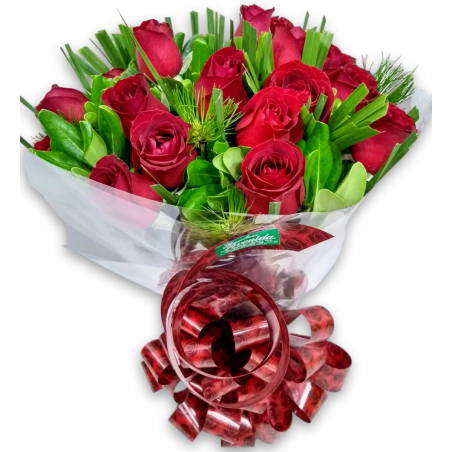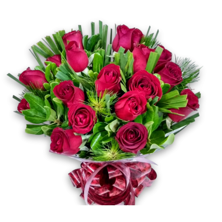 Buquê com 18 rosas e folhagens. Buquê compacto.