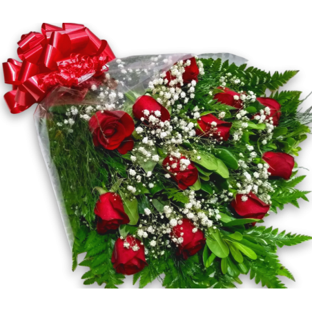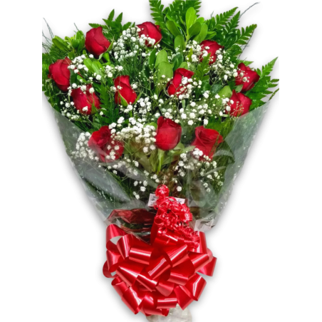 Ramalhete com 12 rosas vermelhas, gipsofila ou áster e folhagens