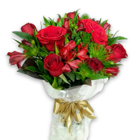 Buquê com 2 rosas importadas, 6 rosas nacionais, astromélias e folhagens.