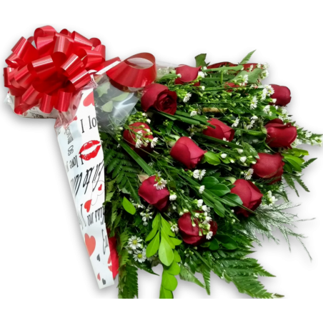 Ramalhete com 12 rosas, áster e folhagens, envolvidos em um lindo papel com corações e palavras "amor".