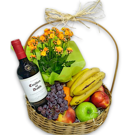 Cesta composta por 1 vinho Casillero, 1 calandiva e 7 tipos de frutas.