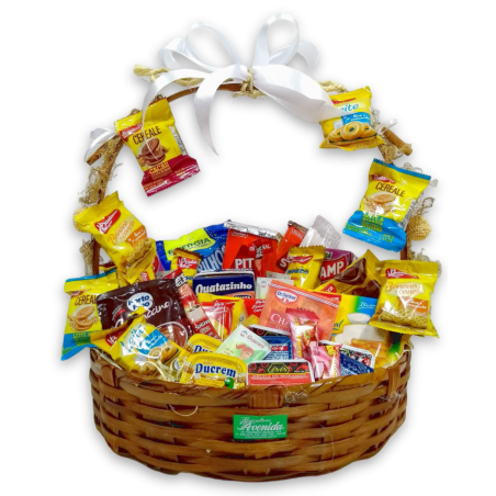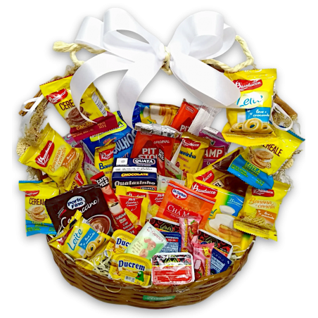 Cesta café da manhã composta por 1 suco, 2 achocolatado, 1 biscoito recheado,1 torrada, 1 cream cracker, 1 biscoito maisena, 4 biscoito sabores, 2 açucar, 2 chás, 1 capuccino, 2 cafés, 2 pit stop, 2 torrones, 1 sucrilhos, 1 biscoito wafer, 2 chocolate, 3 ducrem, 4 geleia, 2 barrinhas, 1 bolinho, 2 goiabinha, toalha de papel e talher. Na falta de qualquer item, sera substituído por outo de mesmo valor e qualidade.