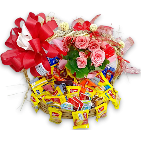 Cesta café da manhã composta por 1 suco, 2 achocolatado, 1 biscoito recheado,1 torrada, 1 cream cracker, 1 biscoito maisena, 4 biscoito sabores, 2 açucar, 2 chás, 1 capuccino, 2 cafés, 2 pit stop, 2 torrones, 1 sucrilhos, 1 biscoito wafer, 2 chocolate, 3 ducrem, 4 geleia, 2 barrinhas, 1 bolinho, 2 goiabinha, toalha de papel e talher. Na falta de qualquer item, sera substituído por outo de mesmo valor e qualidade.