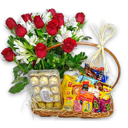 Cesta com arranjo de 12 rosas com astromélias, Ferrero Rocher com 12 unidades, 1 suco, 2 achocolatado, 1 biscoito recheado,1 torrada, 1 cream cracker, 1 biscoito maisena, 4 biscoito sabores, 4 açúcar, 2 chás, 1 capuccino, 1 cafés, 2 pit stop, 2 torrones, 1 sucrilhos, 1 biscoito wafer, 2 chocolate, 3 ducrem, 4 geleia, 2 barrinhas, 1 bolinho e 2 goiabinhas. Na falta de qualquer item, sera substituído por outo de mesmo valor e qualidade.