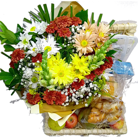 Baú com arranjo de flores do campo, melão, maçã, pera, manga, banana, 2 tipos de pães, 2 frios, ferrero rocher com 12 unidades e caixa de bombons.