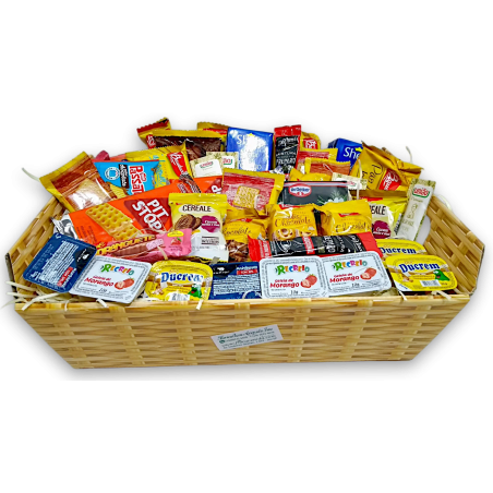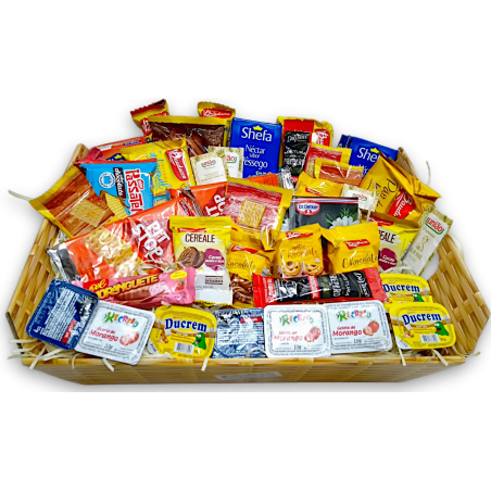 Bandeja café da manhã composta por 1 suco, 2 achocolatado, 1 biscoito recheado,1 torrada, 1 cream cracker, 1 biscoito maisena, 4 biscoito sabores, 2 açucar, 2 chás, 1 capuccino, 2 cafés, 2 pit stop, 2 torrones, 1 sucrilhos, 1 biscoito wafer, 2 chocolate, 3 ducrem, 4 geleia, 2 barrinhas, 1 bolinho, 2 goiabinha, toalha de papel e talher. Na falta de qualquer item, sera substituído por outo de mesmo valor e qualidade.