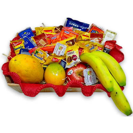 Cesta na bandeja decorada com papel crepom. 1 mamão, 1 laranja, 1 maça, 2 bananas, 1 suco, 2 achocolatado, 1 biscoito recheado,1 torrada, 1 cream cracker, 1 biscoito maisena, 4 biscoito sabores, 2 açucar, 2 chás, 1 capuccino, 2 cafés, 2 pit stop, 2 torrones, 1 sucrilhos, 1 biscoito wafer, 2 chocolate, 3 ducrem, 4 geleia, 2 barrinhas, 1 bolinho, 2 goiabinha, toalha de papel e talher. Na falta de qualquer item, sera substituído por outo de mesmo valor e qualidade.Atenção: A imagem apresentada deste produto é similar ao produto que será entregue, podendo haver variações em suas características. Dúvidas? Entre em contato com floravenida.com