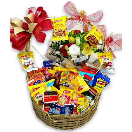 Cesta com arranjo de 3 rosas, 1 suco, 2 achocolatado, 1 biscoito recheado,1 torrada, 1 cream cracker, 1 biscoito maisena, 4 biscoito sabores, 2 açucar, 2 chás, 1 capuccino, 2 cafés, 2 pit stop, 2 torrones, 1 sucrilhos, 1 biscoito wafer, 2 chocolate, 3 ducrem, 4 geleia, 2 barrinhas, 1 bolinho, 2 goiabinha, toalha de papel e talher. Na falta de qualquer item, sera substituído por outo de mesmo valor e qualidade.