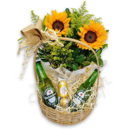 Cesta com arranjo de 2 girassóis, 2 cervejas e 1 ferrero rocher com 3 unidades.