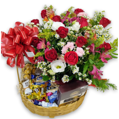 Cesta com arranjo de 12 rosas, 1 cx de bombons sortidos, 1 ferrero rocher com 12 unidades e 1 ferrero colection com 7 unidades.
