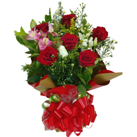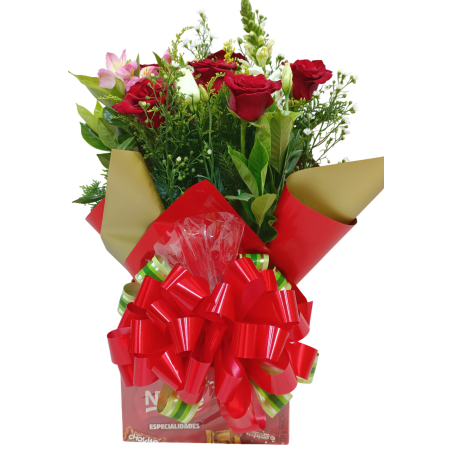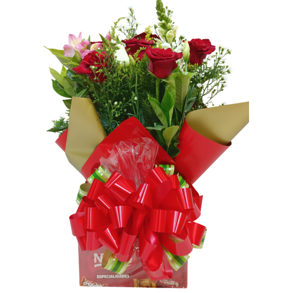 Lindo arranjo com 6 rosas e 1 caixa de bombons (podendo ser Nestlé ou Lacta, depende da disponibilidade do produto na floricultura) - 1432