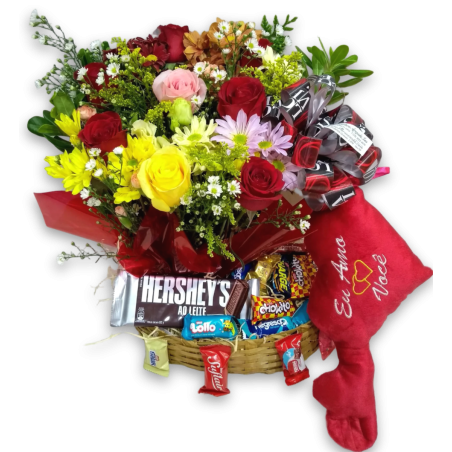 Cesta arranjo com 6 rosas. áster, tango, folhagens, boca de leão ou astromélias, flores miúdas da época, 1 cx de bombons sortidos (podendo ser Nestlé ou Lacta, depende da disponibilidade do produto na floricultura), coração de pelúcia de 30cm com braços, 1 barra de chocolate.