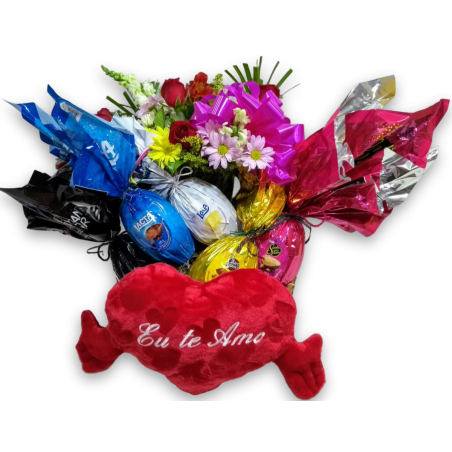 Cesta com 5 ovos de páscoa, pelúcia e arranjo de flores do campo - 1595