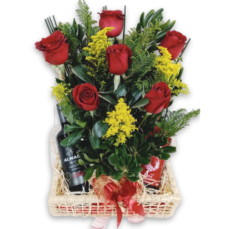 Baú de palha com arranjo de 6 rosas e 2 vinhos Almadén - 1624