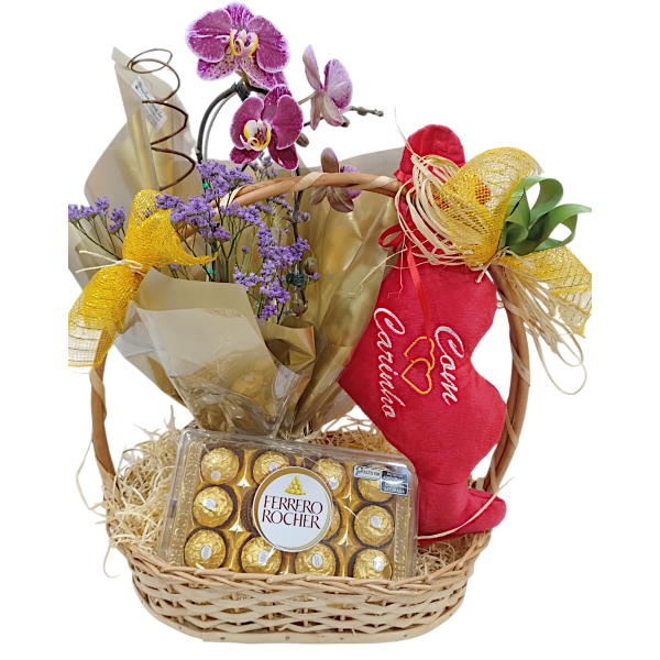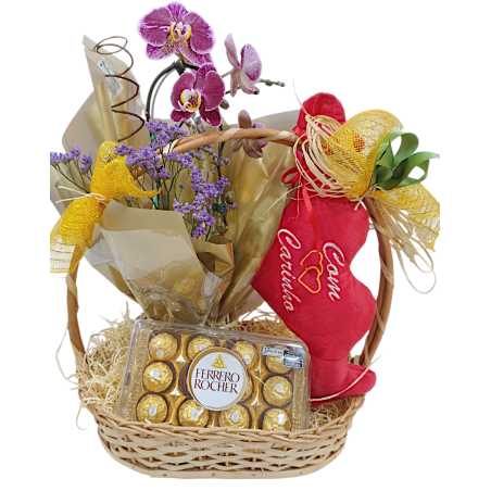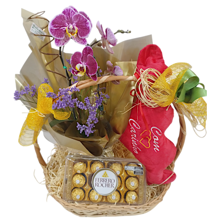 Cesta com 1 orquídea phalaenopsis, 1 coração de pelúcia e 1 Ferrero Rocher com 12 unidades