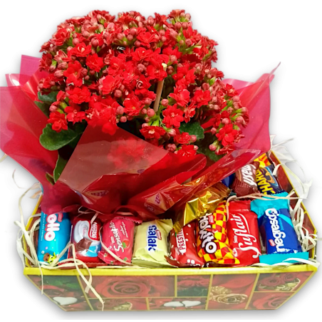 Cesta com 1 calandiva (cor pode variar conforme estoque na loja) e 1 caixa de bombons sortidos.