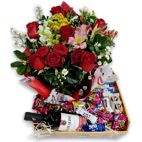 Bandeja com 6 rosas, folhagens, áster, tango, boca de leão ou astromélias, 1 vinho nacional, 1 cx de bombons sortidos e 10 sonho de valsa.