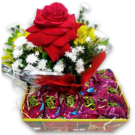 Composição: Arranjo com 1 rosa importada, astromélias, folhagens, tango e aster.