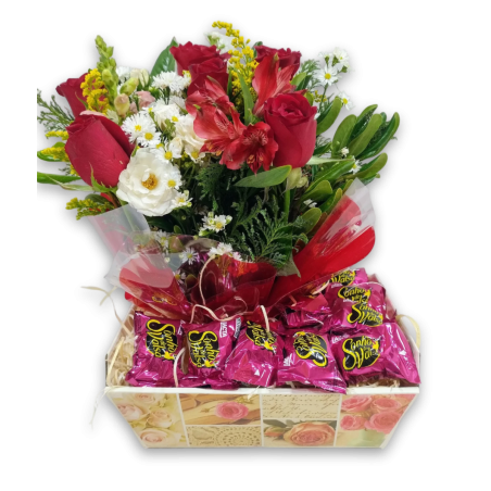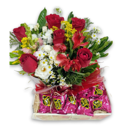 Cesta com arranjo com 6 rosas e 10 bombons sonho de valsa ou ouro branco.