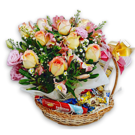Cesta com arranjo de 9 rosas, astromélias, áster e folhagens, Ferrero Rocher com 12 unidades, 1 cx de bombons sortidos e 1 barra de chocolate.