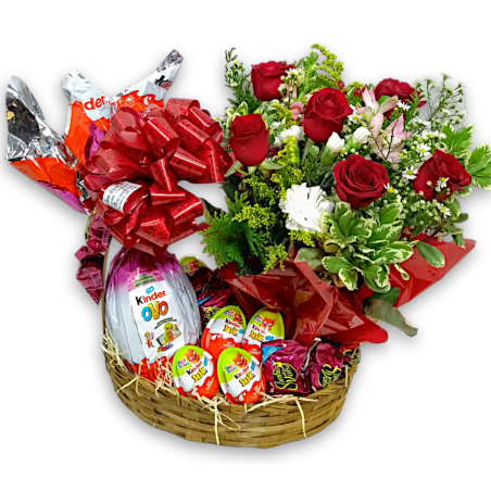 Cesta com arranjo de 6 rosas, ovo de páscoa 150g, 5 kinder ovo e 10 sonho de valsa.