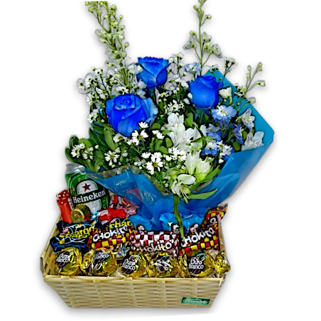 Cesta com 1 caixa de bombons (podendo ser Nestlé ou Lacta, depende da disponibilidade do produto na floricultura), 5 bombons ouro branco, 1 cerveja e arranjo com 3 rosas azuis, astromélias, áster e folhagens.