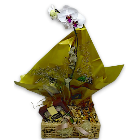 Orquídea phalaenopsis no baú com ferrero collection e 10 bombons ouro branco.