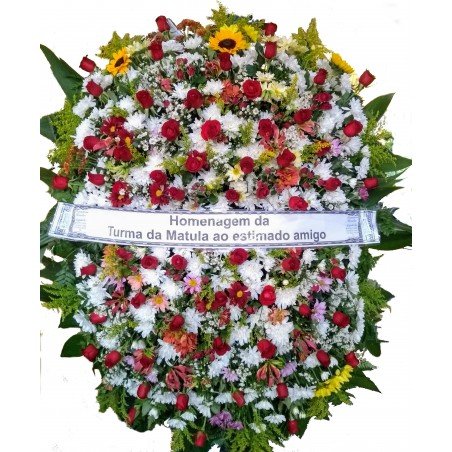 Coroa composta por crisântemos, 5dz de rosas, tango, áster e folhagens.