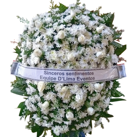 Coroa branca composta por crisântemos, áster, rosas e folhagens.