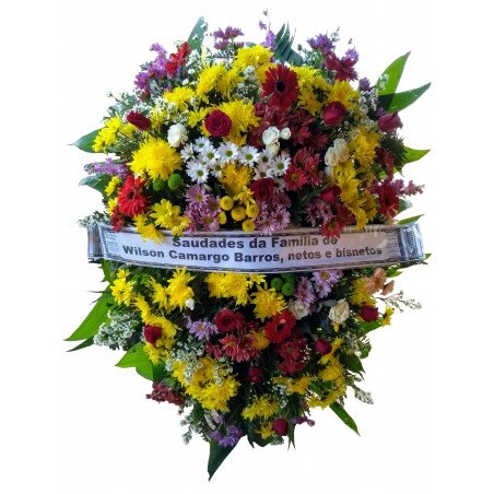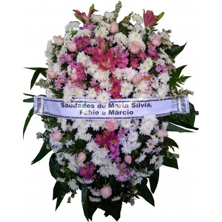 Coroa composta por crisântemos, rosas, flores nobres (lírio, astromelia, gérbera, girassol ou boca de leão), áster, tango e folhagens.