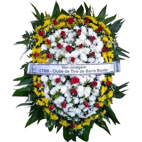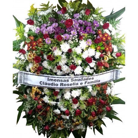 Coroa composta por crisântemos, 30 rosas, áster, tango e folhagens.