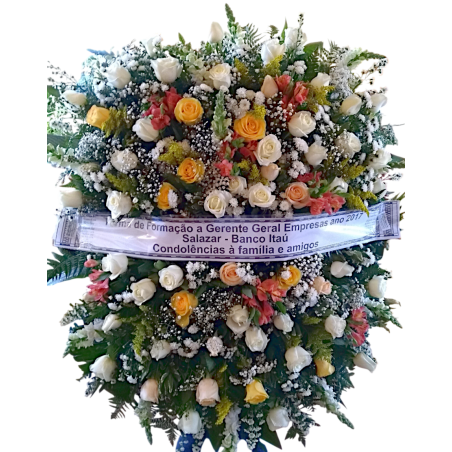 Coroa com 5 dúzias de rosas, boca de leão, astromélia, áster, gipsofila e folhagens.