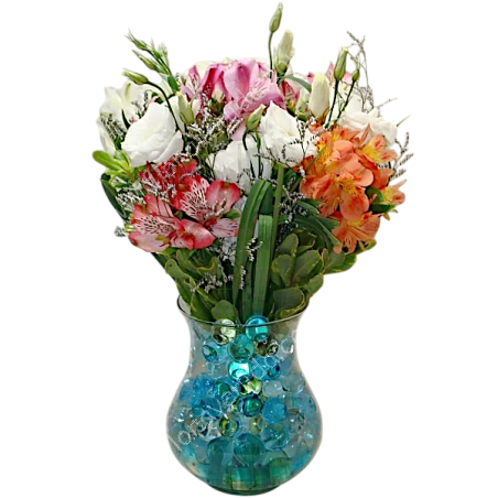 Arranjo com astromélias, lisiantus, cáspia e folhagens no vidro com gel - 1213
