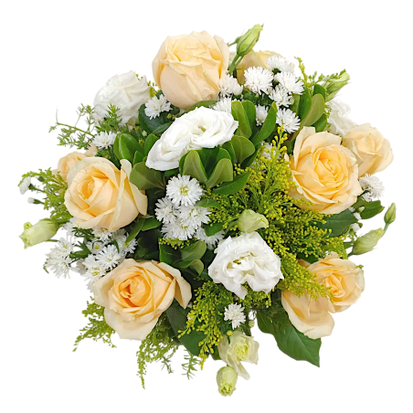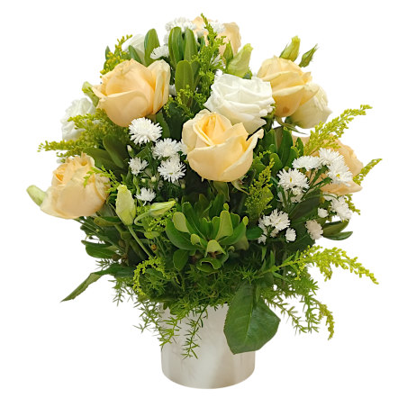Arranjo com 9 rosas, lisiantus, tango, áster e folhagens no cachepot - 1214