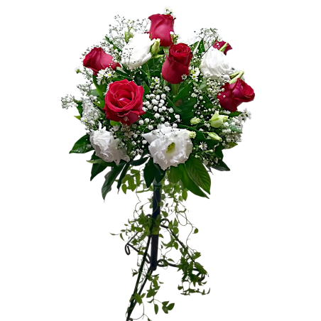 Arranjo de mesa na ferragem com 9 rosas vermelhas, lisiantus, gipsofila, folhagem e hera smilax. (ferragem com locação) - 1249