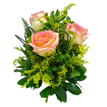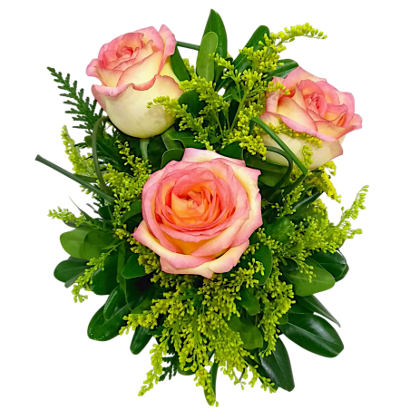 Arranjo com 3 rosas, tango, áster e folhagens.