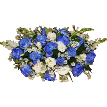 Arranjo para mesa com 18 rosas azuis, boca de leão, liziantus, áster e folhagens