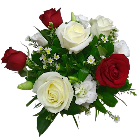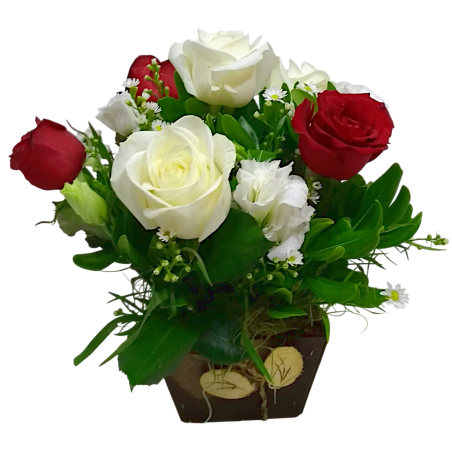 Arranjo no cachepot com 6 rosas, áster, lisiantus ou boca de leão e folhagens.