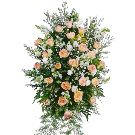 Arranjo frontal com 24 rosas, lisianthus, boca de leão, áster, tango e folhagens