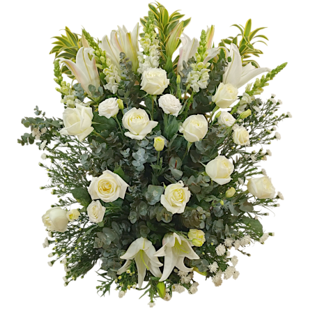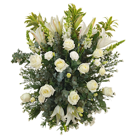 Arranjo com 5 hastes de lírio, 5 bocas de leão, 9 rosas, lisianthus, áster, dracenas e eucalipto.