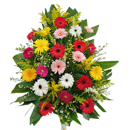Arranjo cone frontal com 24 gérberas, áster, tango e folhagens.