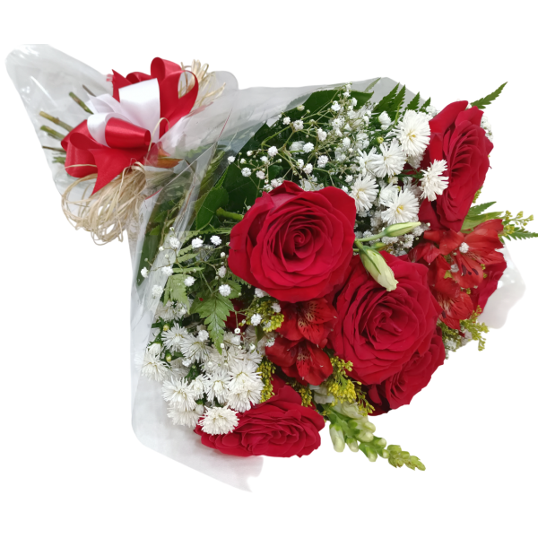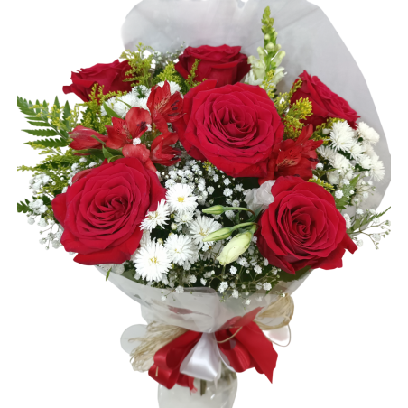 Buquê com 6 rosas importadas, áster, boca de leão ou astromélias, flores miúdas da época e folhagens.